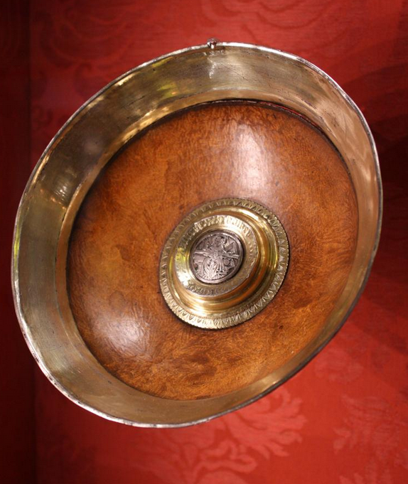 Ornamented types usually have a rim or "band" of precious metal, generally of silver or silver gilt; the foot and the print being also of metal.[2] There are examples with wooden covers, sometimes with a metal handle, such as the Bute Mazer or Flemish and German mazers in the British Museum. On the outside, but generally not the inside of the metal band there is often an inscription, religious, or convivial, and the print was also often decorated with a sculpted or engraved plare, and sometimes a gem.[3] The Bute Mazer is one of the most elaborate to survive, with a three-dimensional reclining lion rising from the base, and enamelled coats of arms in a circle around it. Saints, the religious monogram IHS, and animals, often no doubt with heraldic significance, are other common decorations of the boss. Many metal pieces that appear to be mazer bosses have been excavated.[4] An example from York Minster grants an indulgence of 40 days remission from Purgatory for all who drink from it.[5]