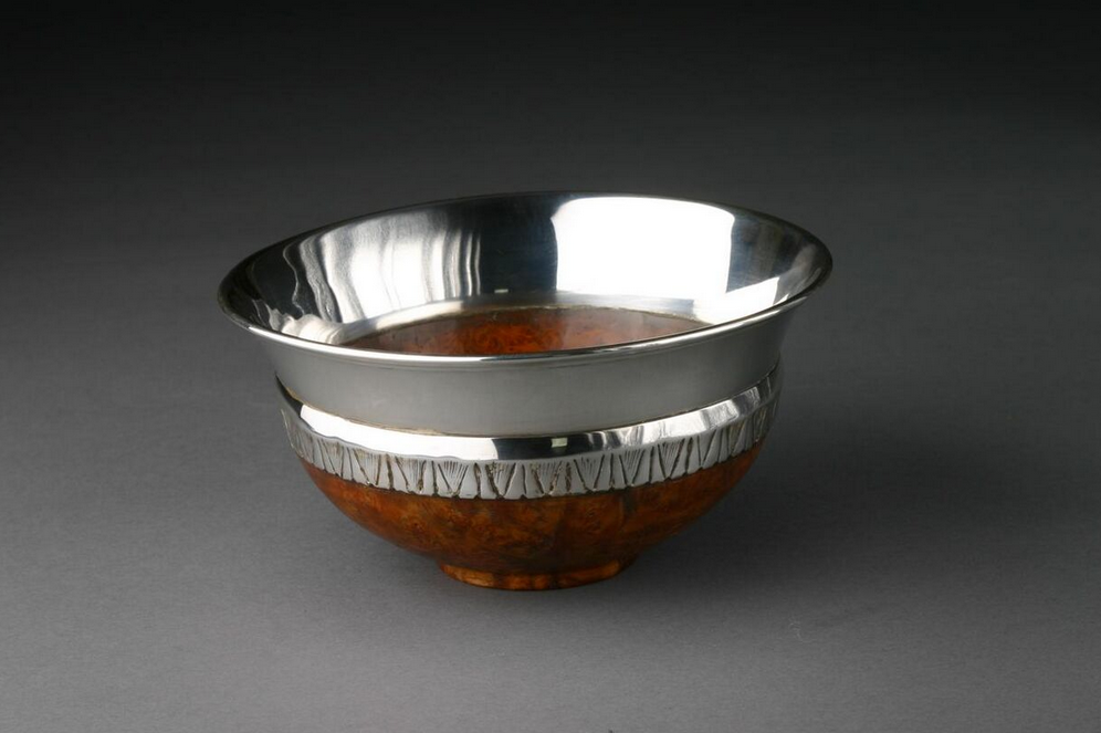 Later examples may be raised on a stem, perhaps copying the style of covered cups;[6] some from about 1550 onwards are effectively tazzas that are partly in wood. The later mazers sometimes had metal straps between the rim and the foot, as were added to the Bute Mazer. Examples continued to be produced after the main period ended in the 16th century, perhaps with a deliberate sense of traditionalism. Some modern woodturners and silversmiths have continued to produce examples, especially Omar Ramsden.[7]