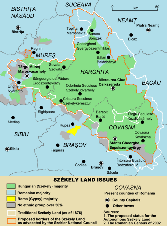 Székely Land (which would have an area of 13,000 km2[19] and a population of 809,000 people of which 75.65% Hungarians) |