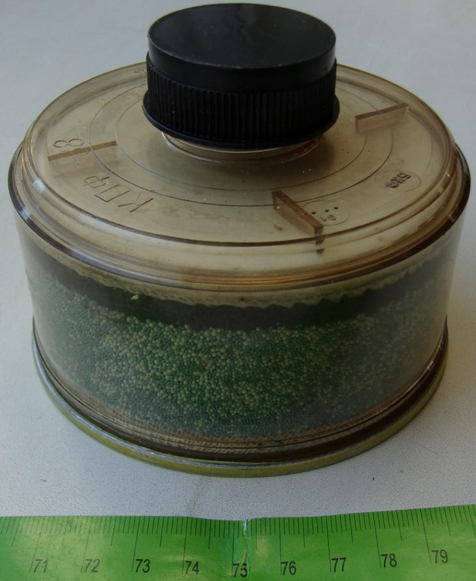 Chemical cartridge respirators use a cartridge to remove gases, volatile organic compounds (VOCs), and other vapors from breathing air by adsorption, absorption, or chemisorption. A typical organic vapor respirator cartridge is a metal or plastic case containing from 25 to 40 grams of sorption media such as activated charcoal or certain resins. The service life of the cartridge varies based, among other variables, on the carbon weight and molecular weight of the vapor and the cartridge media, the concentration of vapor in the atmosphere, the relative humidity of the atmosphere, and the breathing rate of the respirator wearer. When filter cartridges become saturated or particulate accumulation within them begins to restrict air flow, they must be changed.[6]