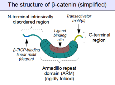 The segments N-terminal and far C-terminal to the ARM domain do not adopt any structure in solution by themselves. Yet these intrinsically disordered regions play a crucial role in beta-catenin function. The N-terminal disordered region contains a conserved short linear motif responsible for binding of TrCP1 (also known as β-TrCP) E3 ubiquitin ligase – but only when it is phosphorylated. Degradation of β-catenin is thus mediated by this N-terminal segment. The C-terminal region, on the other hand, is a strong transactivator when recruited onto DNA. This segment is not fully disordered: part of the C-terminal extension forms a stable helix that packs against the ARM domain, but may also engage separate binding partners.[4] This small structural element (HelixC) caps the C-terminal end of the ARM domain, shielding its hydrophobic residues. HelixC is not necessary for beta-catenin to function in cell–cell adhesion. On the other hand, it is required for Wnt signaling: possibly to recruit various coactivators, such as 14-3-3zeta.[5] Yet its exact partners among the general transcription complexes are still incompletely understood, and they likely involve tissue-specific players.[6] Notably, the C-terminal segment of β-catenin can mimic the effects of the entire Wnt pathway if artificially fused to the DNA binding domain of LEF1 transcription factor.[7]