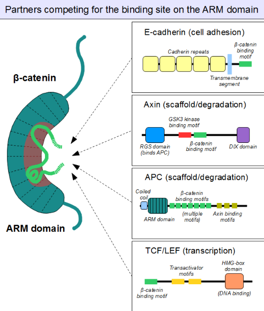 Similarly, we find the familiar E-cadherin, whose cytoplasmatic tail contacts the ARM domain in the same canonical fashion.[14] The scaffold protein axin (two closely related paralogs, axin 1 and axin 2) contains a similar interaction motif on its long, disordered middle segment.[15] Although one molecule of axin only contains a single β-catenin recruitment motif, its partner the Adenomatous Polyposis Coli (APC) protein contains 11 such motifs in tandem arrangement per protomer, thus capable to interact with several β-catenin molecules at once.[16] Since the surface of the ARM domain can typically accommodate only one peptide motif at any given time, all these proteins compete for the same cellular pool of β-catenin molecules. This competition is the key to understand how the Wnt signaling pathway works.
