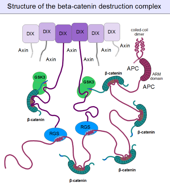 But even axin does not act alone. Through its N-terminal regulator of G-protein signaling (RGS) domain, it recruits the adenomatous polyposis coli (APC) protein. APC is like a huge "Christmas tree": with a multitude of β-catenin binding motifs (one APC molecule alone possesses 11 such motifs [16]), it may collect as many β-catenin molecules as possible.[21] APC can interact with multiple axin molecules at the same time as it has three SAMP motifs (Ser-Ala-Met-Pro) to bind the RGS domains found in axin. In addition, axin also has the potential to oligomerize through its C-terminal DIX domain. The result is a huge, multimeric protein assembly dedicated to β-catenin phosphorylation. This complex is usually called the beta-catenin destruction complex, although it is distinct from the proteosome machinery actually responsible for β-catenin degradation.[22] It only marks β-catenin molecules for subsequent destruction.