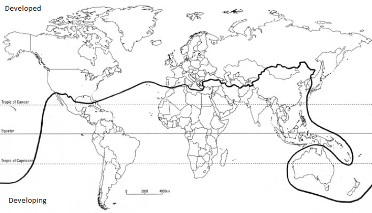 The Brandt Line is a visual depiction of the north–south divide, proposed by West German former Chancellor Willy Brandt in the 1980s in the report titled North-South: A Programme for Survival which was later known as the Brandt Report.[12] This line divides the world at a latitude of approximately 30° North, passing between North and Central America, north of Africa and the Middle East, climbing north over China and Mongolia, but dipping south so as to include Australia and New Zealand in the "Rich North".