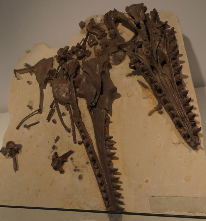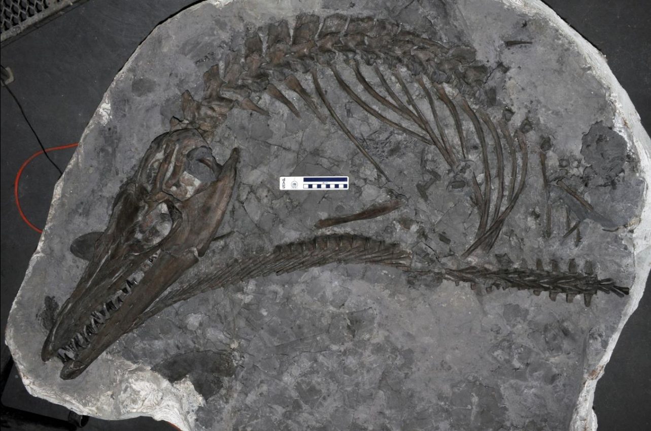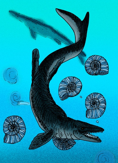 Mosasaurus may have taught their offspring how to hunt, as supported by a fossil nautiloid Argonautilus catarinae with bite marks from two conspecific mosasaurs, one being from a juvenile and the other being from an adult. Analysis of the tooth marks by a 2014 study by Kauffman concluded that the mosasaurs were either Mosasaurus or Platecarpus. The positioning of both bite marks are at the direction the nautiloid's head would have been facing, indicating it was incapable of escaping and was thus already sick or dead during the attacks; it is possible this phenomenon was from a parent mosasaur teaching its offspring about cephalopods as an alternate source of prey and how to hunt one. An alternate explanation postulates the bite marks as from one individual mosasaur that lightly bit the nautiloid at first, then proceeded to bite again with greater force. However, there are differences in tooth spacing between both bites which indicate different jaw sizes.[87]