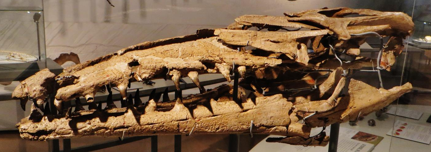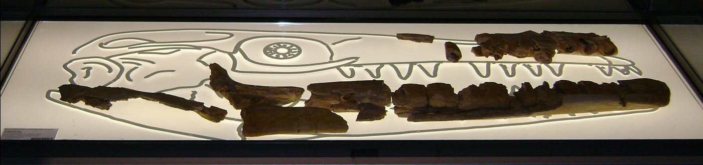The type specimen of M. missouriensis was first described in 1834 by Richard Harlan based on a snout fragment found along the river's Big Bend.[11] He coined the specific epithet and initially identified it as a species of Ichthyosaurus[16] but later as an amphibian.[17] The rest of the skull had been discovered earlier by a fur-trapper, and it eventually came under the possession of prince Maximilian of Weid-Neuwied between 1832 and 1834. The fossil was delivered to Georg August Goldfuss in Bonn for research, who published a study in 1845. The same year, Christian Erich Hermann von Meyer suspected that the skull and Harlan's snout were part of the same individual. This was confirmed in 2004.[11]