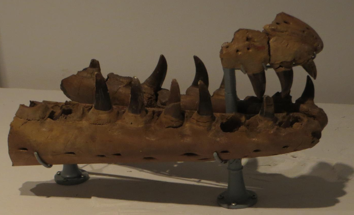 The dentition was thecodont (tooth roots deeply cemented within the jaw bone). Teeth were constantly shed through a process where the replacement tooth developed within the root of the original tooth and then pushed it out of the jaw.[57] Chemical studies conducted on a M. hoffmannii maxillary tooth measured an average rate of deposition of odontoblasts, the cells responsible for the formation of dentin, at 10.9 micrometers (0.00043 in) per day. This was by observing the von Ebner lines, incremental marks in dentin that form daily. It was approximated that it took the odontoblasts 511 days and dentin 233 days to develop to the extent observed in the tooth.[58][59]