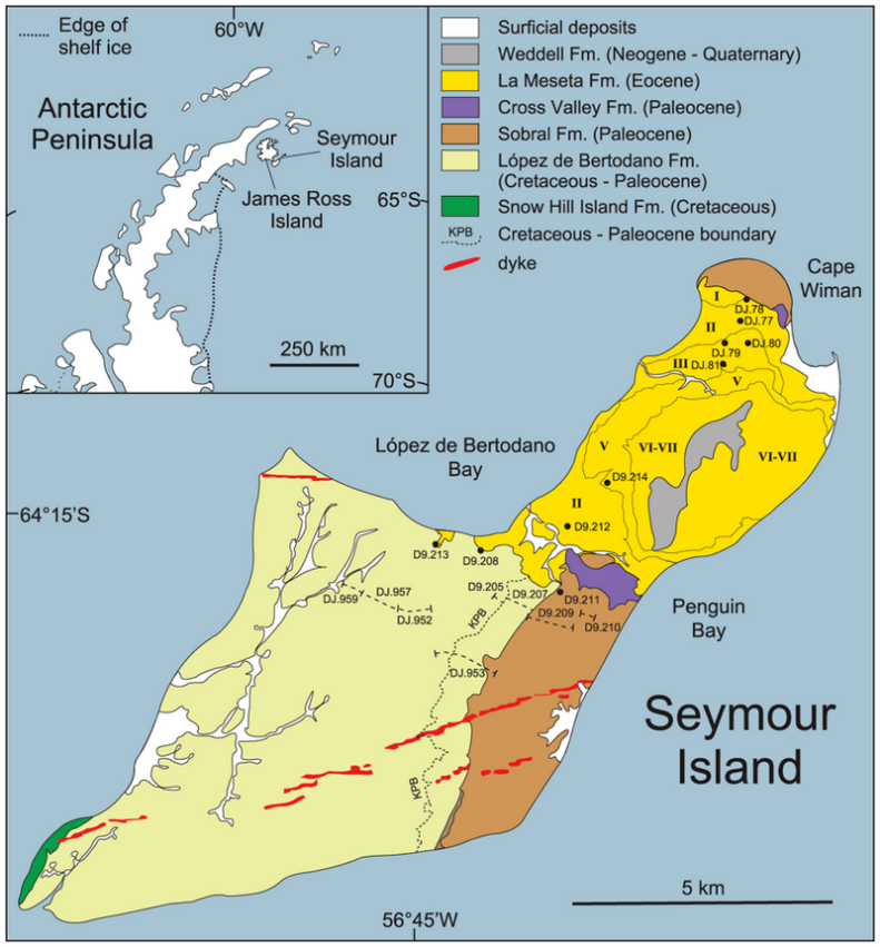 Mosasaurus is known from late Maastrichtian deposits in the Antarctic Peninsula, specifically the López de Bertodano Formation in Seymour Island.[83] Located within the polar circle at around 65°S,[102] temperatures at medium to large water depths would have been around 6 °C (43 °F) on average, while sea surface temperatures may have dropped below freezing and sea ice may have formed at times.[82][120] Mosasaurus appears to be the most diverse mosasaur in the Maastrichtian Antarctica. At least two species of Mosasaurus have been described, but the true number of species is unknown as remains are often fragmentary and specimens are described in open nomenclature. These species include one comparable with M. lemonnieri, and another that appears to be closely related to M. hoffmannii.[83] M. sp. has also been described. However, it is possible that such specimens may actually represent Moanasaurus, although this depends on the outcome of a pending revision of the genus.[24] At least four other mosasaur genera have been reported in Antarctica, including Plioplatecarpus, the mosasaurines Moanasaurus and Liodon,[83] and Kaikaifilu. The validity of some of these genera is disputed as they are primarily based on isolated teeth.[121] Prognathodon and Globidens are also expected to be present based on distribution trends of both genera, although conclusive fossils have yet to be found.[83] Other Antarctic marine reptiles included elasmosaurid plesiosaurs like Aristonectes and another indeterminate elasmosaurid.[122] The fish assemblage of the López de Bertodano Formation was dominated by Enchodus and ichthyodectiformes.[123]