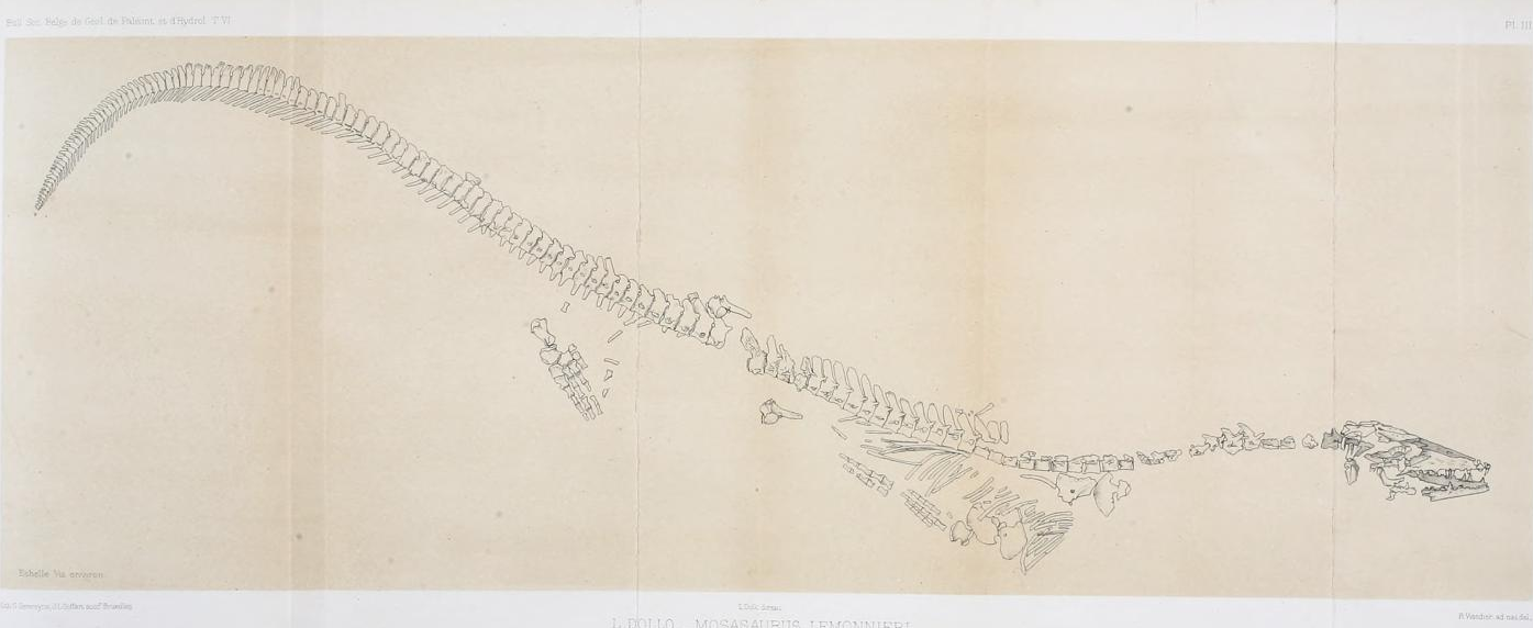 The fourth species M. lemonnieri was first detected by Camper Jr. based on fossils from his father's collections, which he discussed with Cuvier during their 1799 correspondence, but Cuvier rejected the idea of another Mosasaurus species.[3][21] This species was re-introduced to science and formally described in 1889 by Louis Dollo based on a skull recovered from a phosphate quarry in Belgium.[22] Further mining of the quarry in subsequent years uncovered many additional well-preserved fossils, including multiple partial skeletons which collectively represented nearly the entire skeleton of the species. They were described by Dollo in later papers.[10][23] Despite being the best anatomically represented species, M. lemonnieri was largely ignored in scientific literature. Theagarten Lingham-Soliar suggested two reasons for this neglect. First, M. lemonnieri fossils are endemic to Belgium and the Netherlands, which despite the famous discovery of the M. hoffmannii holotype attracted little attention from mosasaur paleontologists. Second, the species was overshadowed by the more famous and history-rich type species.[23]