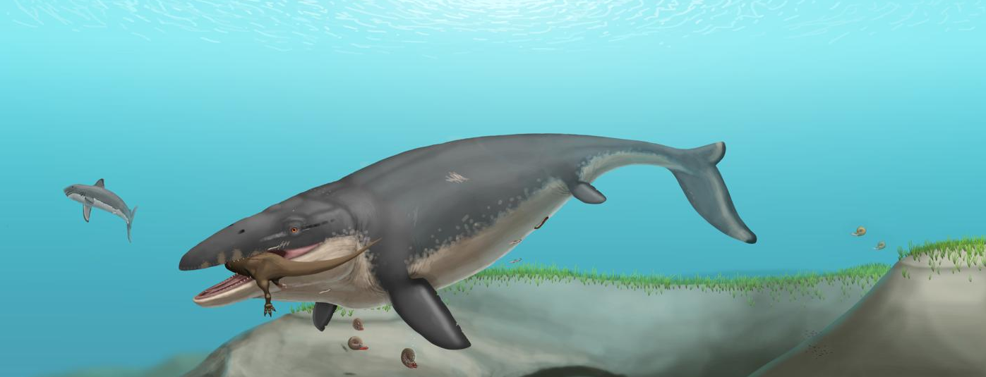 Mosasaurus was a type of derived mosasaur, or a latecoming member with advanced evolutionary traits such as a fully aquatic lifestyle. As such, it had a streamlined body, an elongated tail ending with a downturn supporting a two-lobed fin, and two pairs of flippers. While in the past derived mosasaurs were depicted as akin to giant flippered sea snakes, it is now understood that they were more similar in build to other large marine vertebrates such as ichthyosaurs, marine crocodylomorphs, and archaeocete whales through convergent evolution.[32][33][34]