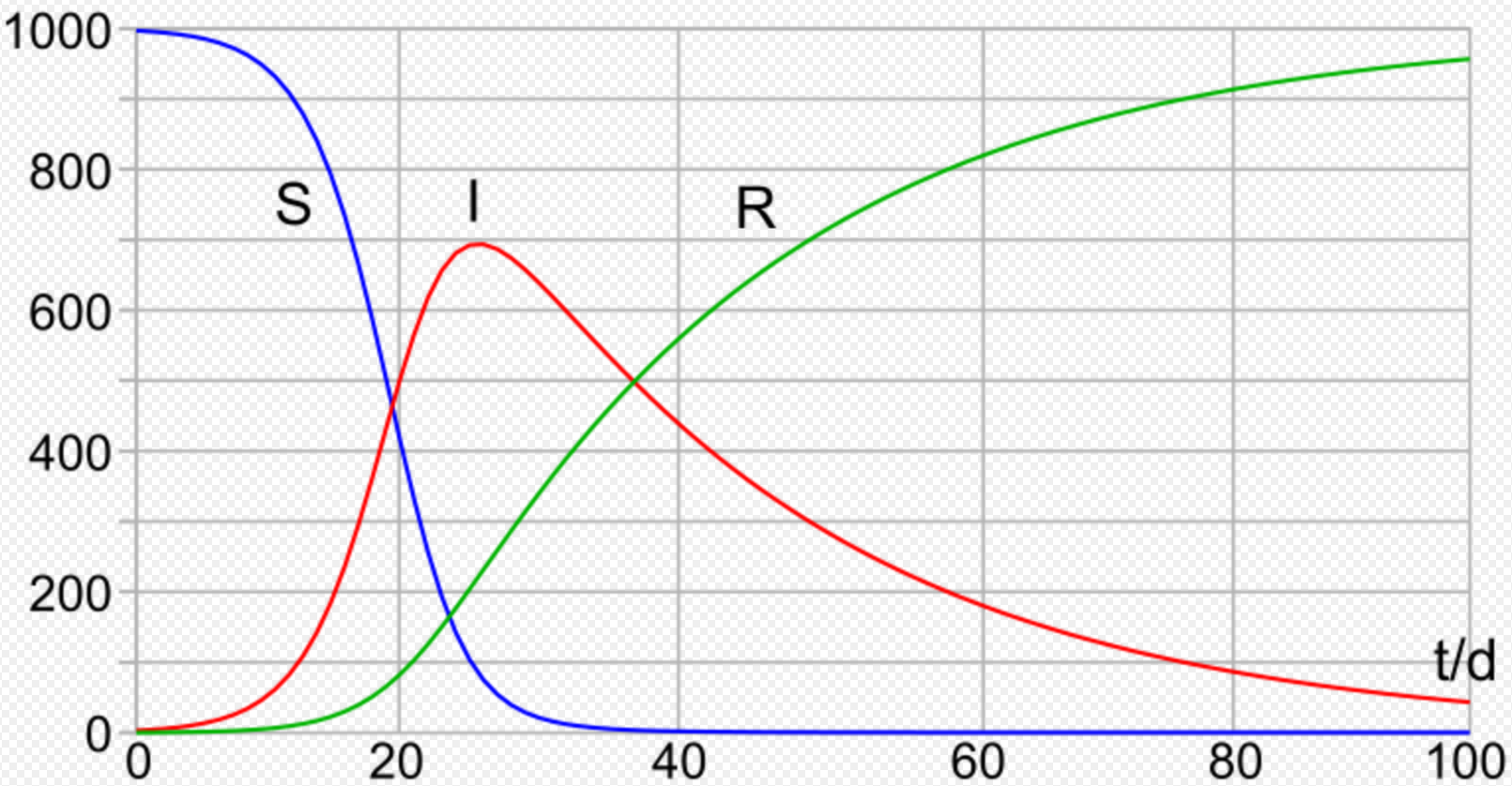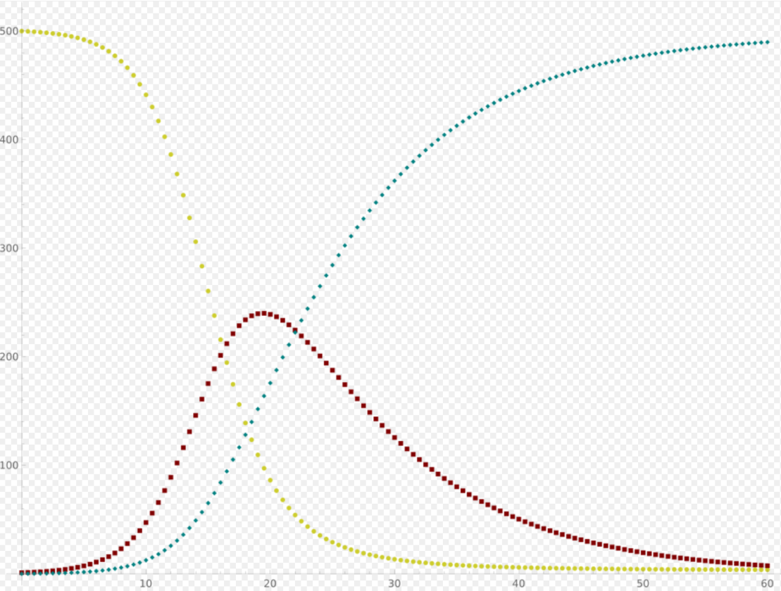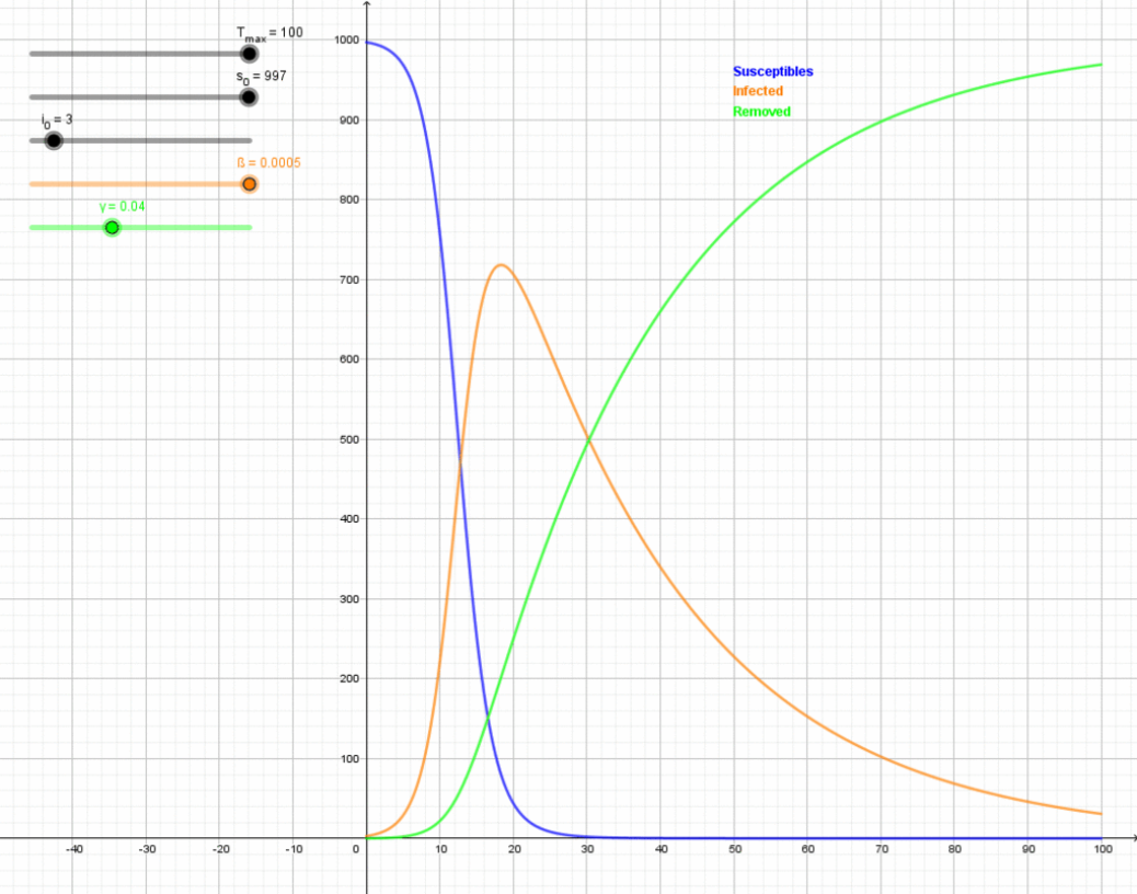 where [math]\displaystyle{ S }[/math] is the stock of susceptible population, [math]\displaystyle{ I }[/math] is the stock of infected, [math]\displaystyle{ R }[/math] is the stock of removed population (either by death or recovery), and [math]\displaystyle{ N }[/math] is the sum of these three.