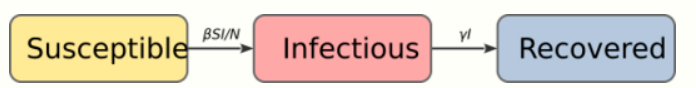 Each member of the population typically progresses from susceptible to infectious to recovered. This can be shown as a flow diagram in which the boxes represent the different compartments and the arrows the transition between compartments, i.e.