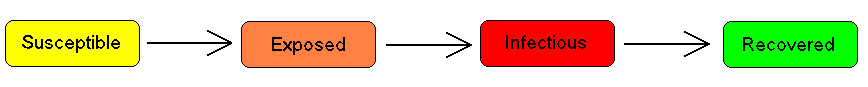 For many important infections, there is a significant latency period during which individuals have been infected but are not yet infectious themselves. During this period the individual is in compartment E (for exposed).