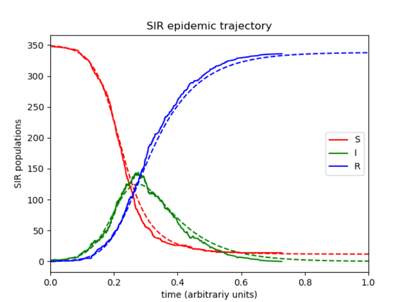 Using a fixed population, [math]\displaystyle{ N = S(t) + I(t) + R(t) }[/math] in the three functions resolves that the value [math]\displaystyle{ N }[/math] should remain constant within the simulation, if a simulation is used to solve the SIR model. Alternatively, the analytic approximant[3] can be used without performing a simulation. The model is started with values of [math]\displaystyle{ S(t=0) }[/math], [math]\displaystyle{ I(t=0) }[/math] and [math]\displaystyle{ R(t=0) }[/math]. These are the number of people in the susceptible, infected and removed categories at time equals zero. If the SIR model is assumed to hold at all times, these initial conditions are not independent.[3] Subsequently, the flow model updates the three variables for every time point with set values for [math]\displaystyle{ \beta }[/math] and [math]\displaystyle{ \gamma }[/math]. The simulation first updates the infected from the susceptible and then the removed category is updated from the infected category for the next time point (t=1). This describes the flow persons between the three categories. During an epidemic the susceptible category is not shifted with this model, [math]\displaystyle{ \beta }[/math] changes over the course of the epidemic and so does [math]\displaystyle{ \gamma }[/math]. These variables determine the length of the epidemic and would have to be updated with each cycle.