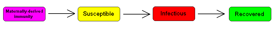 For many infections, including measles, babies are not born into the susceptible compartment but are immune to the disease for the first few months of life due to protection from maternal antibodies (passed across the placenta and additionally through colostrum). This is called passive immunity. This added detail can be shown by including an M class (for maternally derived immunity) at the beginning of the model.