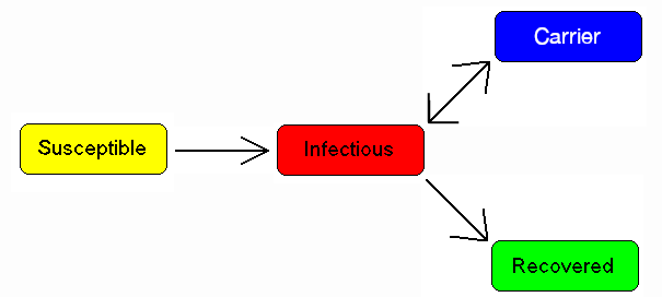 Some people who have had an infectious disease such as tuberculosis never completely recover and continue to carry the infection, whilst not suffering the disease themselves. They may then move back into the infectious compartment and suffer symptoms (as in tuberculosis) or they may continue to infect others in their carrier state, while not suffering symptoms. The most famous example of this is probably Mary Mallon, who infected 22 people with typhoid fever. The carrier compartment is labelled C.