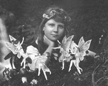 One of the five photographs of Frances Griffiths with the alleged fairies, taken by Elsie Wright in July 1917. https://handwiki.org/wiki/index.php?curid=1954953