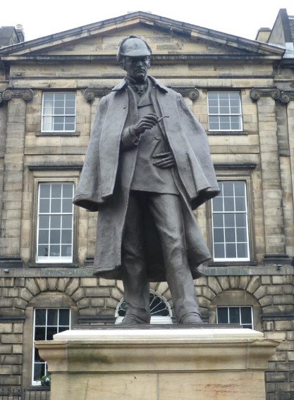 Sherlock Holmes statue in Edinburgh, erected opposite the birthplace of Doyle, which was demolished c. 1970. https://handwiki.org/wiki/index.php?curid=1654368
