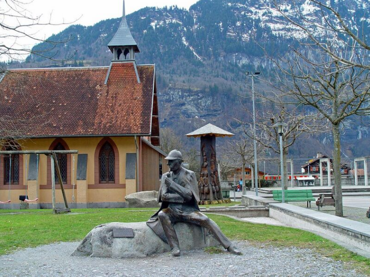 Statue of Holmes and the English Church in Meiringen. https://handwiki.org/wiki/index.php?curid=1563393