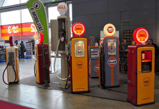 Display of various antique fuel pumps at Retro Classics 2018 in Stuttgart, Germany. https://handwiki.org/wiki/index.php?curid=1833473