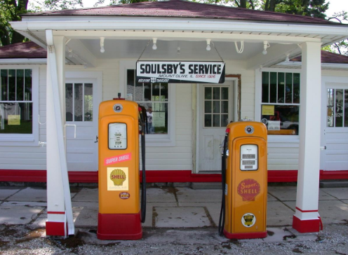 Two types of Shell gasoline pumps at Soulsby Service Station in Mount Olive, Illinois, USA. https://handwiki.org/wiki/index.php?curid=1668118