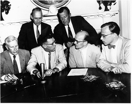 Waterman is seated at left; to his right are Presidential Press Secretary James Hagerty, Dr. S. Douglas Cornell and Dr. Alan Shapley. Standing: Dr. J. Wallace Joyce and Dr. Athelstan Spilhaus. Announcement of plans for the building and launching of the world's first man-made satellite, July 29, 1955. (NASA) https://handwiki.org/wiki/index.php?curid=1367060