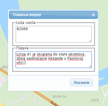 Figure 2. Overview of the information delivery (Figure translation: Пошаљи поруку – Send a message, Листа возила – List of vehicles, Порука – Message, Text of message: Line 41 is redirected to Banjica terminus due to traffic accident in Paunova street.)
