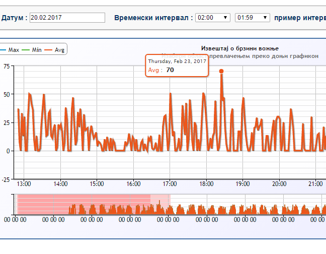 Report on the speed of vehicle (Figure 5) shows a diagram of speed of the selected vehicle at a given time interval. User defines period or a vehicle for which the report is generated. The report generates a two-dimensional diagram, where the X axis shows time (hours of work), and the Y axis shows speed from 0 km/h to 300 km/h. Based on the analysis of data from the chart, for example, it can be concluded that the driver of the vehicle exceeded the speed limit in the period from 6 PM to 7 PM (70 km/h).
