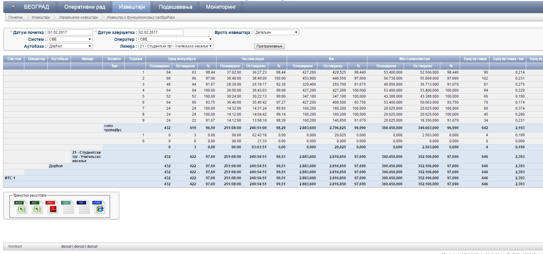 Report on the traffic flow is generated for each line separately and provides access to the data on hours of work of the vehicles, the number of laps as well as on the number of passengers transported. Data is shown for each vehicle separately and in total for the entire line. This report is very important in terms of the analysis of utilization capacity of vehicles on the observed line. Namely, if the utilization capacity of the vehicle is minimal the vehicle schedule can be altered by reducing the number of vehicles on the line and vice versa (Figure 7).