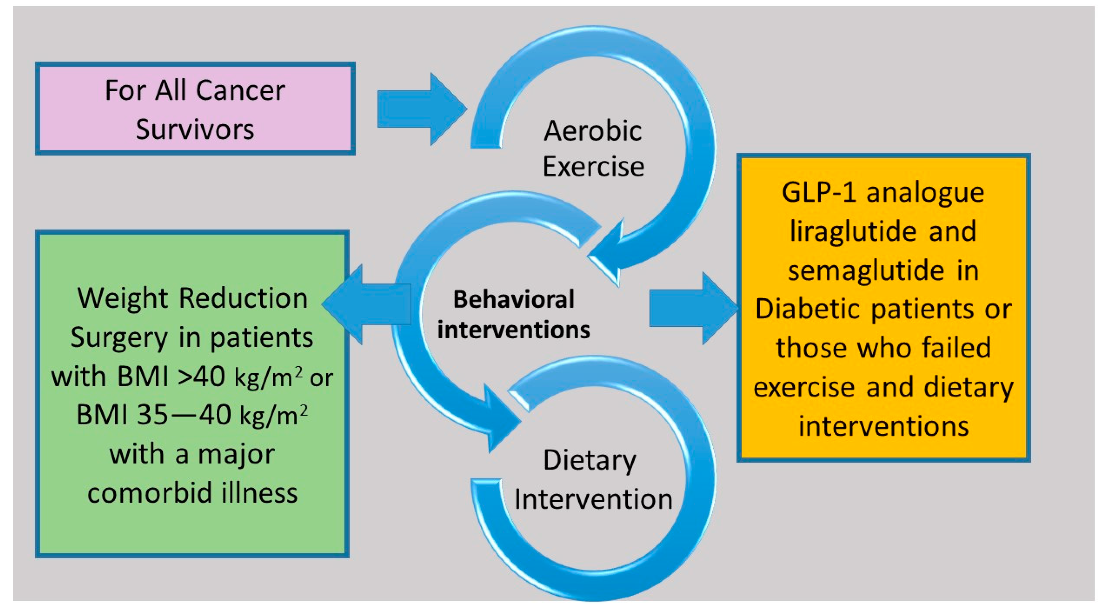 Figure 1. Structured exercise in combination with dietary support and behavior therapy are effective interventions for all cancer survivors. Treatment with glucagon-like peptide-1 analogues and bariatric surgery can be considered in selected cancer survivors.