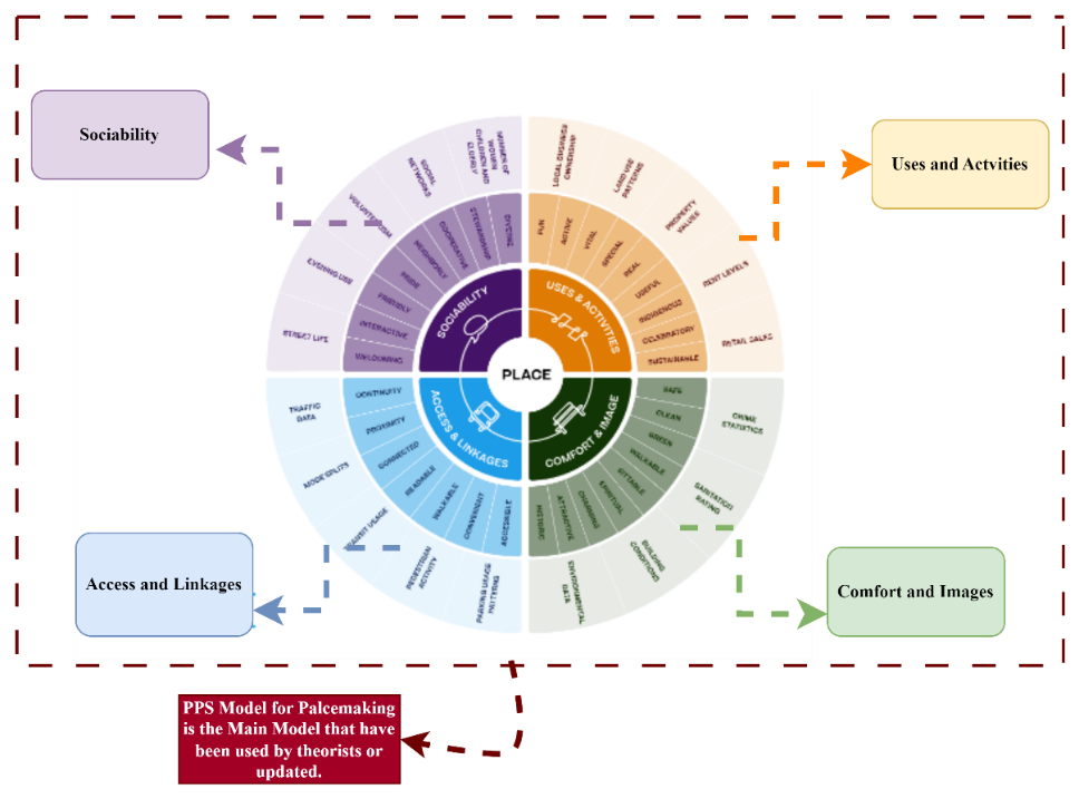 This part displays models adopted by the placemaking concept to identify the influential and frequent dimensions. Several researchers deliberately developed these models or modified them according to the research problem, need, and context they worked with. PPS presented four main dimensions recognized by; uses and activities, comfort and images, access and linkages, and sociability. The following Figures display the models presented by architects, researchers, or development organizations. After comparing these models, they were regrouped according to the types of dimensions that introduced by PPS. To determine the basic dimensions on which the theoretical Framework was erected, the research applied the following steps: