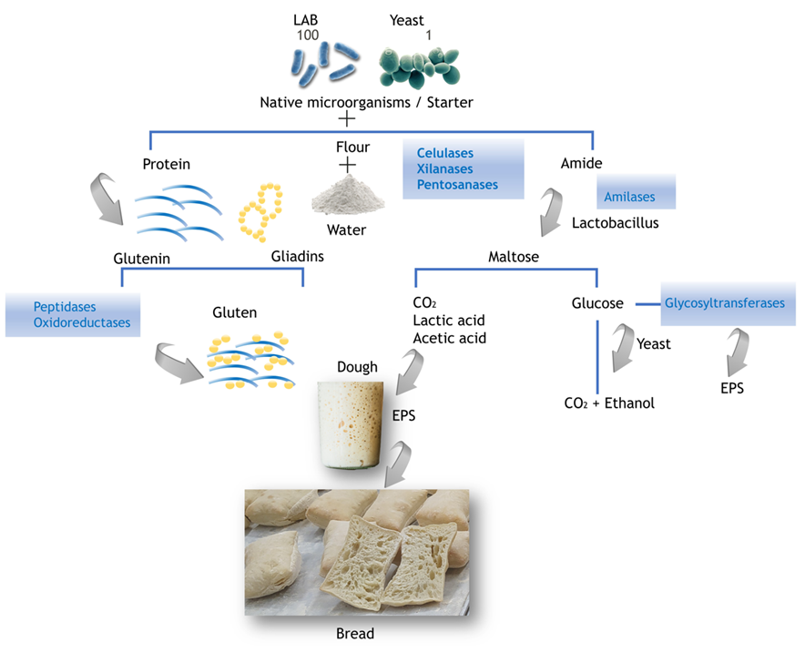 Figure 3. General scheme of bread sourdough fermentation and the major enzymes involved. EPS: Exopolysaccharides.