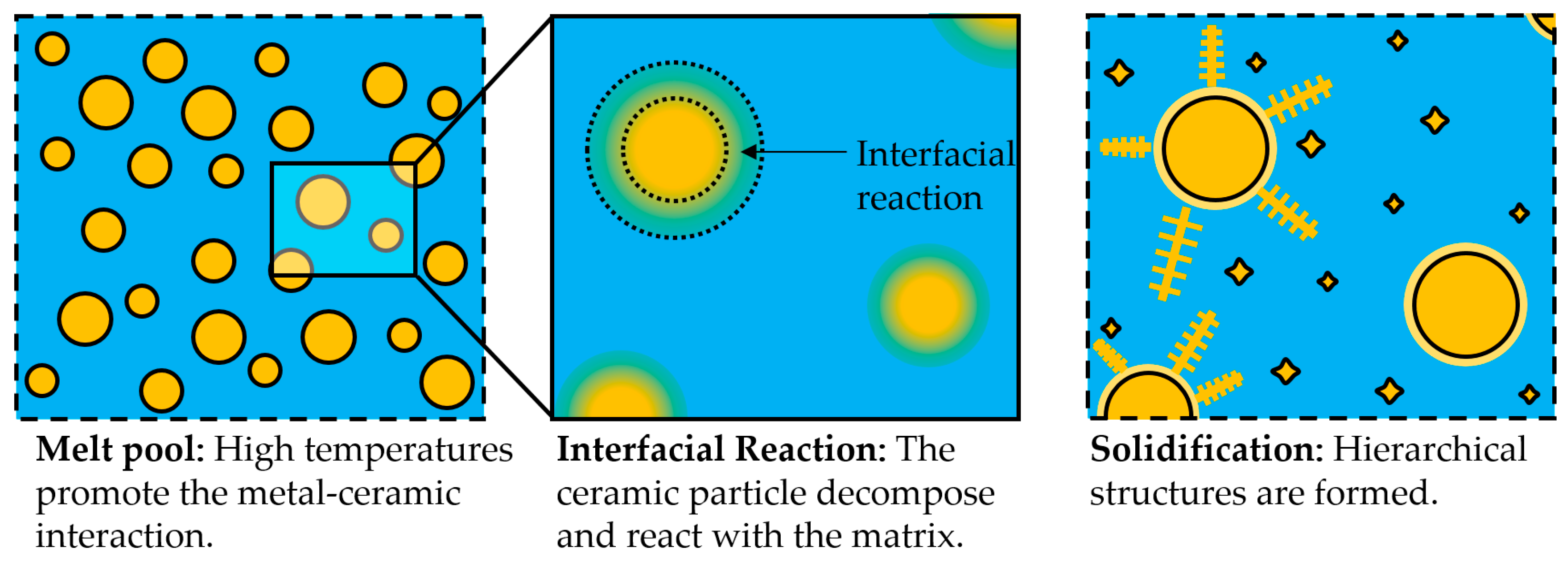According to the formal definition of the composites, the material systems obtained through the second approach do not correspond to MMCs but rather to alloys with dispersed hard phases, as no macroscopic phases could be distinguished. However, these complex alloys are often referred to as MMCs in the literature. In addition, controlling the dissolution of the ceramic phase in ex-situ-produced MMCs is not a trivial matter. In ceramic-reinforced MMCs produced via L-DED, the ceramic particles often suffer partial dissolution, which promotes interfacial reactions between the ceramic and metallic materials