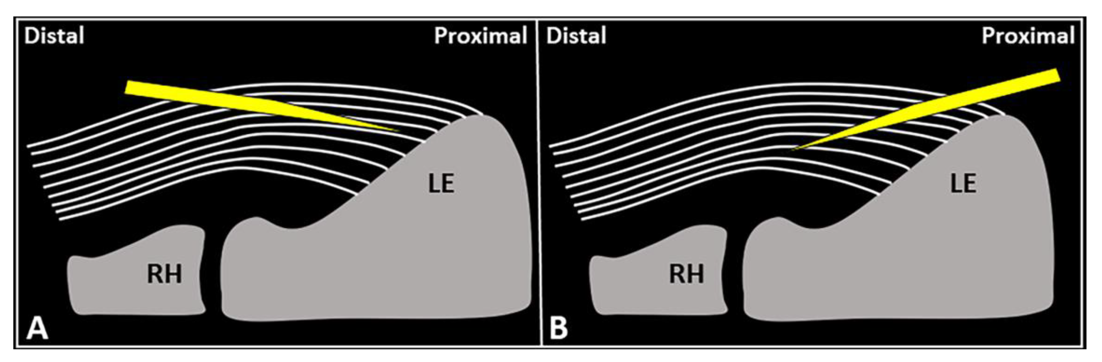 Figure 2. When the needle’s tip (yellow) is correctly positioned just over the superficial edge of the CET, by gently tilting (curved dotted arrow) the needle, it is possible to “separate” the forearm fascia (red) from the underlying tendon without hard resistance (A). Conversely, if the needle’s tip (yellow) is located inside the superficial portion of the CET, a “block” can be felt during this maneuver due to the intratendinous entrapment of the needle between the tendon fibers (white lines) (B). RH: radial head, LE: lateral epicondyle.