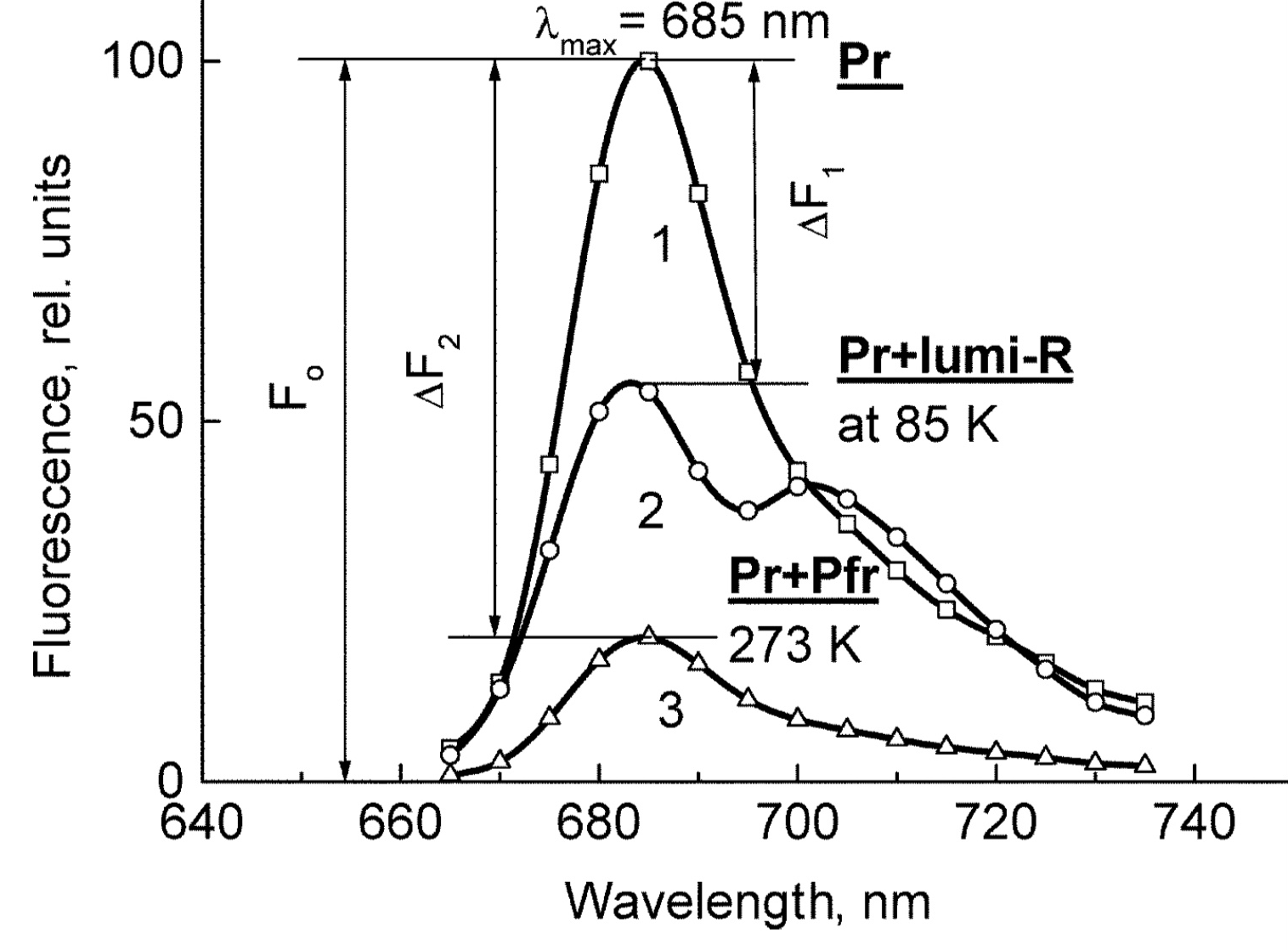 Figure 1. The low-temperature fluorescence method for phytochrome in-situ assay. To characterize the pigment, three fluorescence spectra of phytochrome were measured at 85 K and excitation wavelength at 633 nm: (1) in etiolated tissues (of wheat) when all phytochrome is in its Pr form; (2) in the same sample after saturating red illumination at 85 K partially converting Pr into lumi-R, the first stable photoproduct lumi-R; and (3) in the same sample after thawing at 273 K, saturating red illumination converting Pr into Pfr and freezing again at 85 K. Four major parameters were obtained from these spectra: position of the emission spectrum (λmax); total phytochrome content proportional to the fluorescence intensity ([Ptot]≈F0); extent of the Pr lumi-R photoconversion, equal to the relative fluorescence decline (γ1 = ∆F1/F0) and characterizing the initial photoreaction; and the extent of the Pr Pfr photoconversion (γ2 = ∆F2/F0), characterizing the whole phytochrome cycle. From [31][32].
