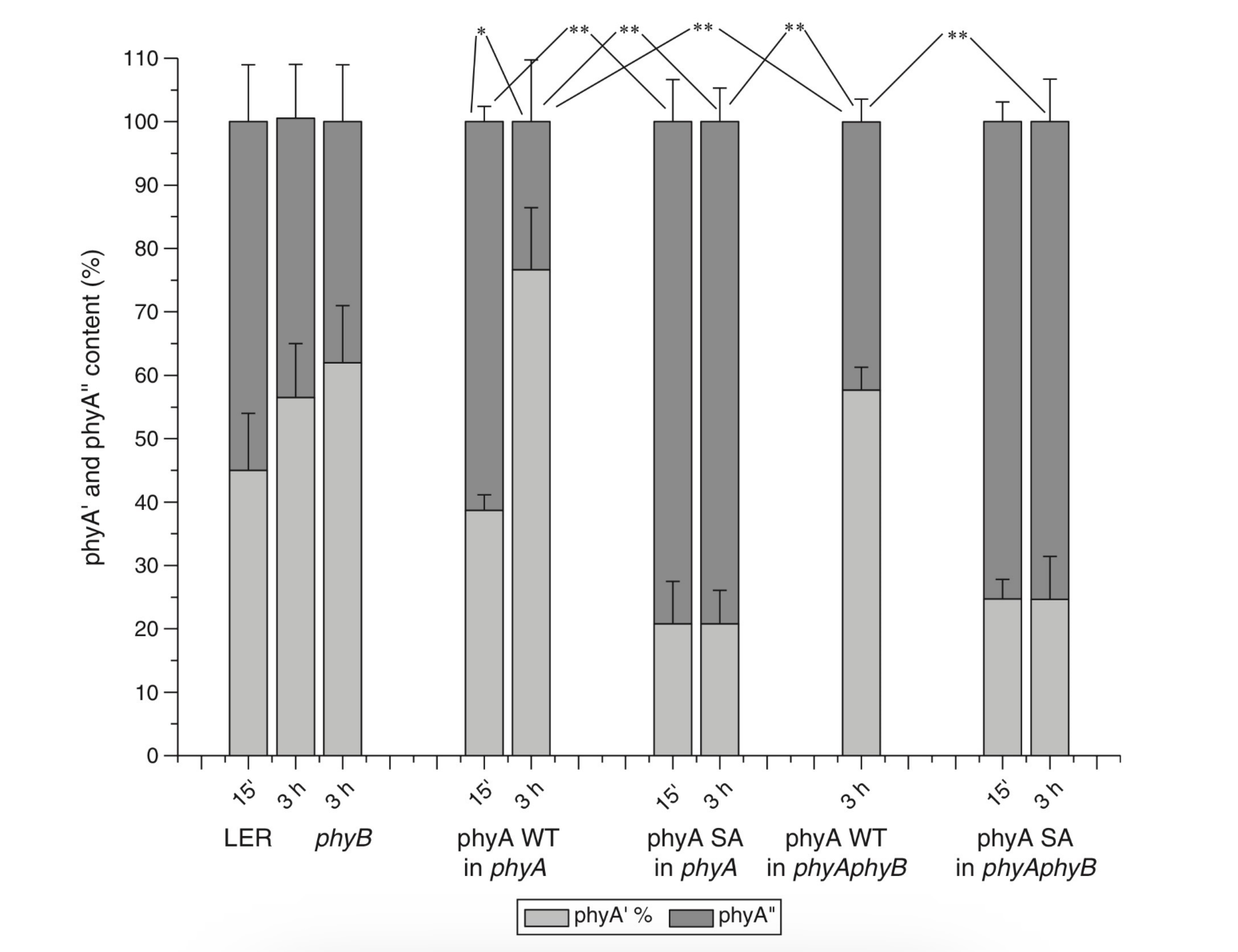 Figure 4. Proportion of the two phytochrome pools, phyA′ and phyA″, in etiolated Arabidopsis plants of the different lines. Significantly different pairs of data (revealed by Fisher’s t-test for 6–12 independent measurements) are indicated: *, p < 0.05 for the same plant lines after brief (15 min) and prolonged (3 h) white light germination-inducing pre-treatment and **, p < 0.05 between different plant lines taken at the same pre-illumination time, 15 min or 3 h. From [47].