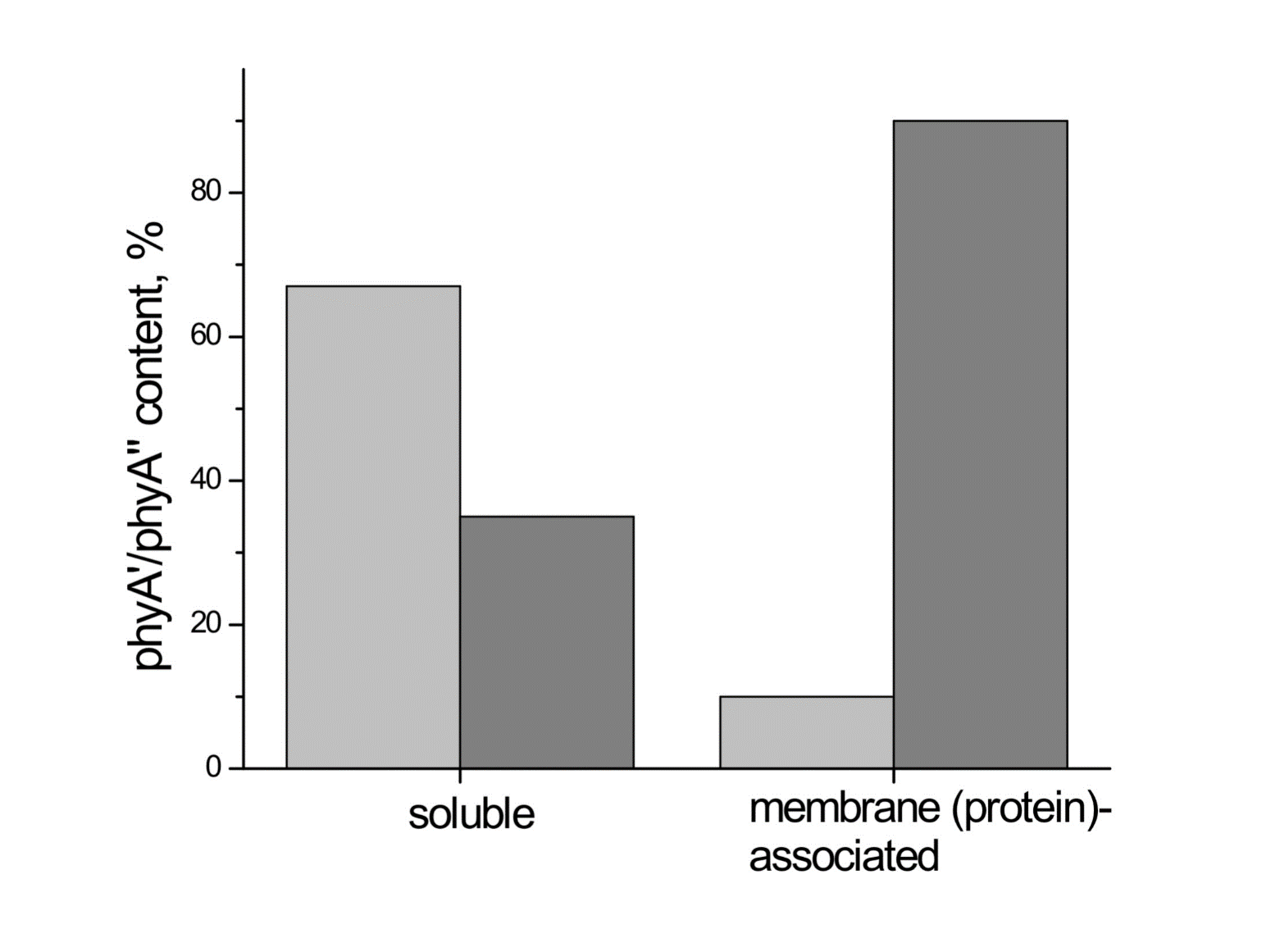 Figure 6. Proportion of phyA′ (light gray) and phyA″ (gray) in water-soluble and membrane-associated fractions of the intact 124 kDa maize phytochrome A in vitro. The error (SD) of the phyA content determination is ca ± 5%. From [60].