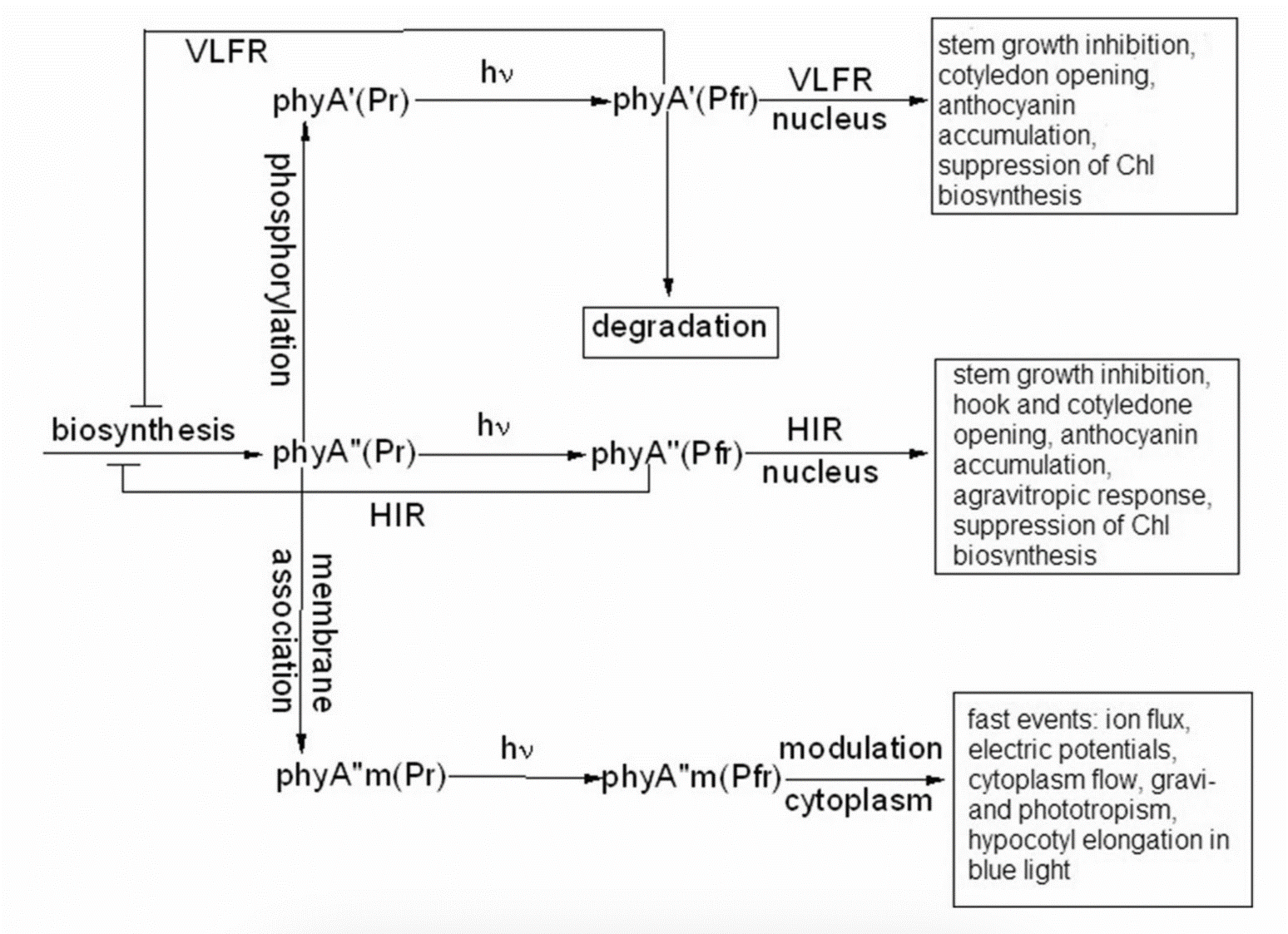 It was widely accepted that plant’s responses were mediated by one molecular phytochrome species. Subsequently, however, compelling evidence for the existence of distinct phytochromes was obtained—the detection of (a) light-labile type 1 and light-stable type 2 phytochromes [19], (b) immunochemically distinct pools [20], (c) species differing by fluorescent and photochemical parameters [21][22], and, most importantly, (d) a divergent family of phytochrome genes with the two major gene products—phyA and phyB [1][23][24]. This implied that different phytochrome types might have unique photoregulatory roles—the VLFR and HIR were attributed to phyA, while the LFR, was to phyB. The phyA may also mediate the LFR. The light signal transduction from phyA and phyB were shown to proceeds, with different dynamics of the process, via separate chains and interacting partners [17][25][26][27][28][29]. The data are being accumulated, however, that phyA is itself structurally heterogeneous and can perform distinct photophysiological functions.