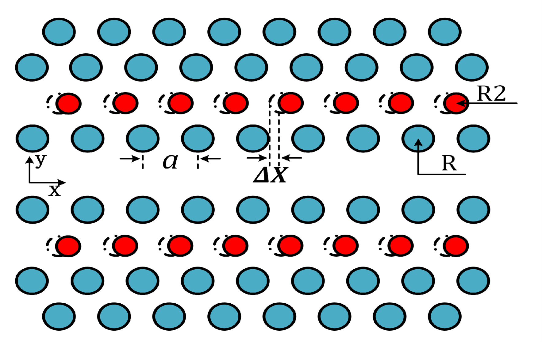 Figure 3. Structure of a photonic crystal waveguide, with air holes represented by blue and red circles. Simulations were made by considering standard silicon-on-insulator air-bridge PhCW of 220 nm thickness, lattice period 400 nm and radius R of the first air-holes row 100 nm. By adjusting the radius R2 and lattice positions ΔX of the second air-holes rows, a very wide flat band larger than 50 nm could be obtained. Reproduced from [26] under Creative Commons License 3.0.