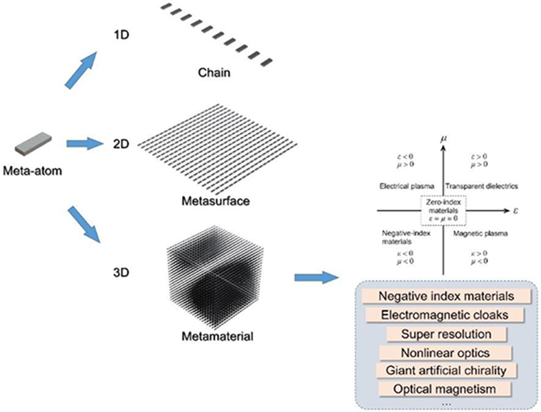 Figure 4. Schematic illustration of meta‐atom, 1D chain, 2D metasurface, and 3D metamaterial. Inserts are the representation of the parameter space for permittivity ε and permeability μ and the typical examples of applications of metamaterials. Adapted from [34] under Creative Commons License 3.0.