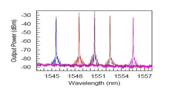 Figure 7 Output spectra from a single-mode silicon photonic-wire waveguide with a cross- section of 220 nm × 445 nm and length of L = 4.2 mm fabricated on a SOI. Pump (λp ~1435 nm) and signal laser sources were multiplexed and launched into the waveguide using a tapered fiber in copropagating configuration; several signal wavelengths (λs =1545.5, 1548.5, 1550.5, 1552.5, and 1555.5 nm) were used. On each side of the signal wavelength employed, newly-generated satellite peaks are clearly seen. Reprinted with permission from [105] © The Optical Society