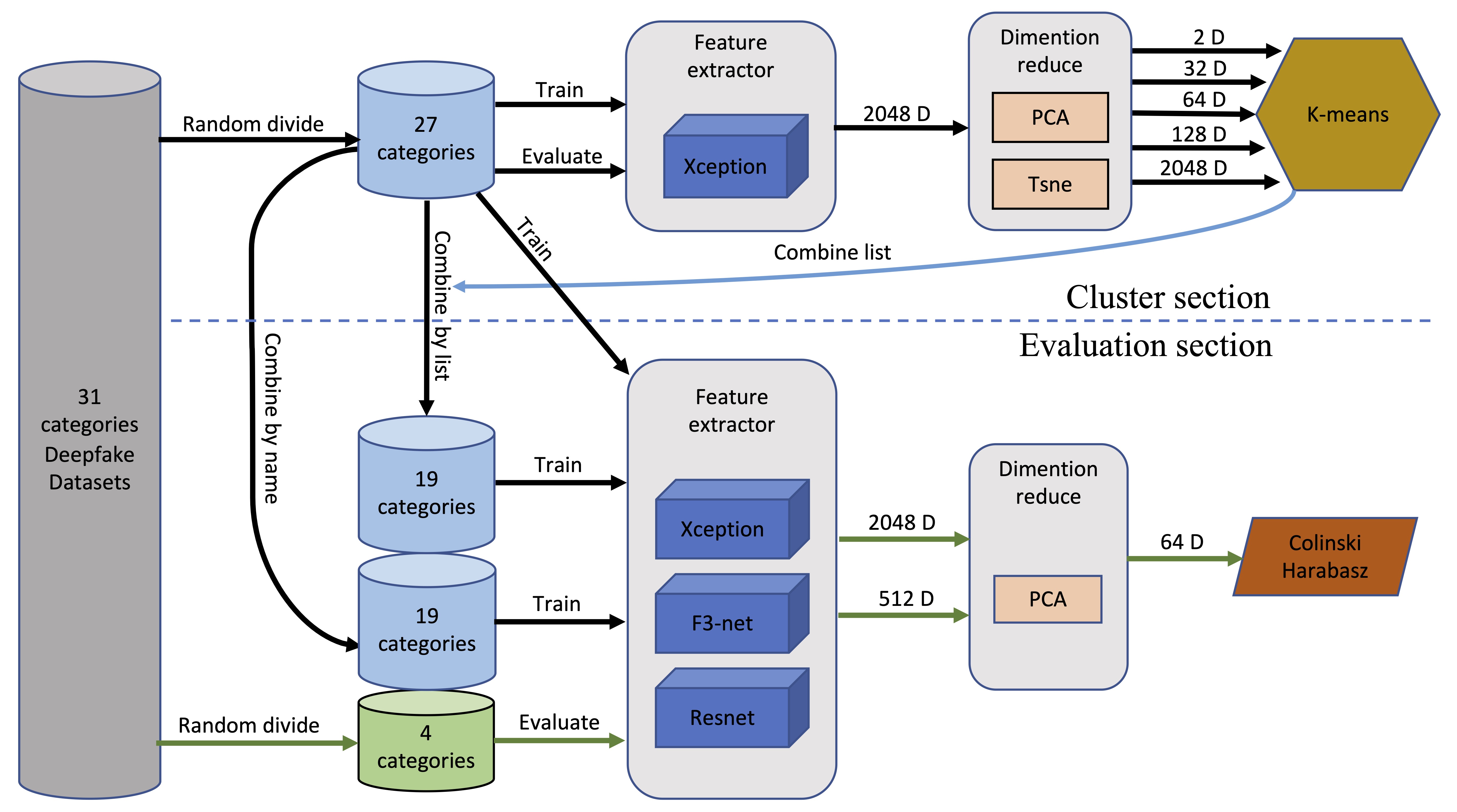 The KCE-System incorporates unsupervised learning. The system divided the deepfake datasets into training sets and evaluation sets. Then it trains a deepfake recognition model using training sets and extracting high-dimensional vectors from the middle layer of the model. After dimensionality reduction, the system used the K-means clustering method to merge various deepfake datasets. Using these datasets, the system then trains the new Xception, F3-net, and ResNet models. The trained models are then used to extract 2048-dimensional or 512-dimensional values from the evaluation set as feature values. Finally, the system uses the Calinski Harabasz Index method on the feature values after dimensionality reduction to evaluate The model’s performance, as shown in Figure 2. Next, we will introduce several main parts of the system in detail.