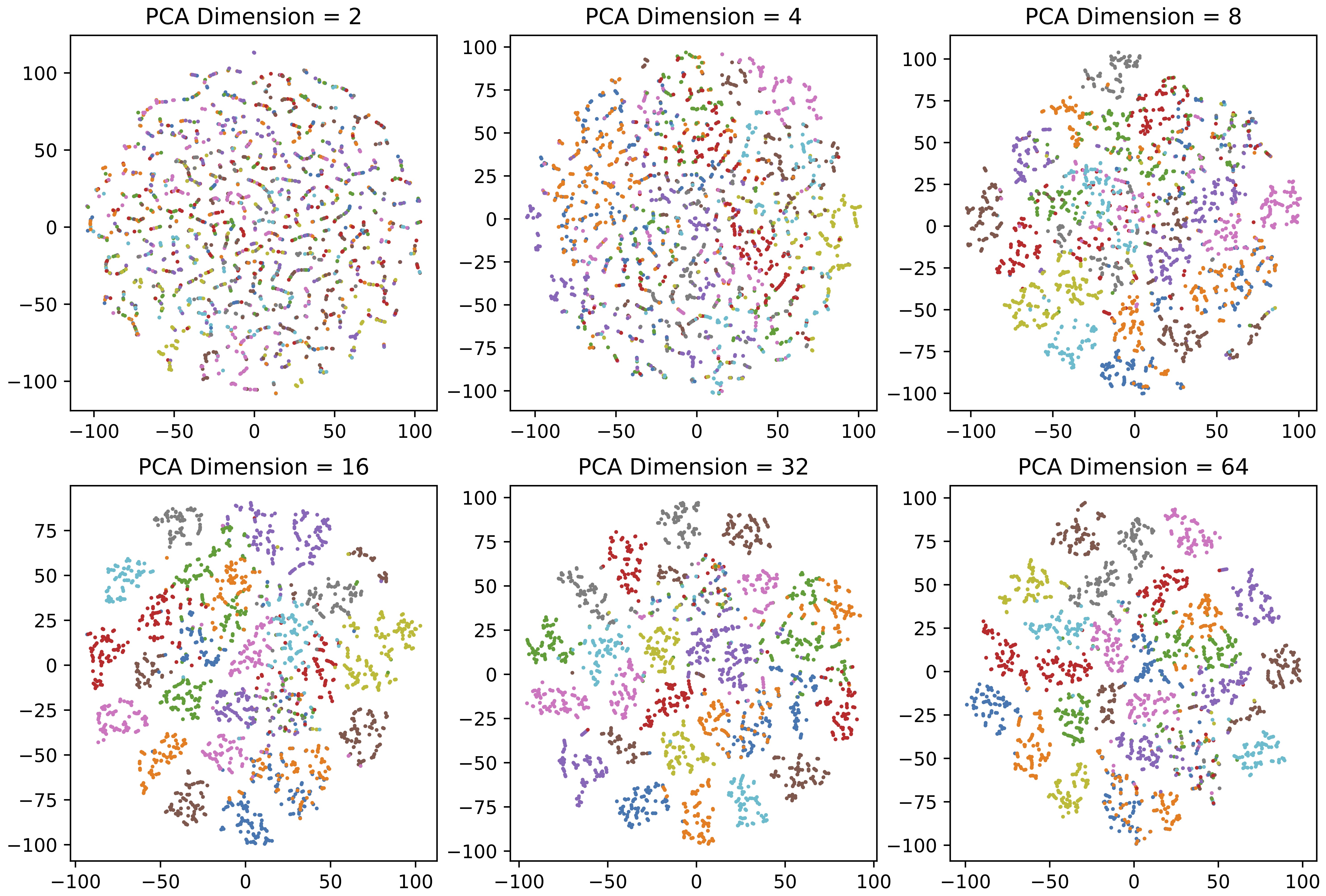 The K-means algorithm uses Euclidean distance for clustering, but it can fail in high dimensions, so a dimension reduction method must be used. PCA [41] and t-SNE [42] are two methods we utilized for comparison. PCA is stable but retains less information when reduced to two or three dimensions. When reducing dimensions to 64 using PCA, the interpretable variance contribution rate can be preserved at 95.2%. From Figure 3, it effectively preserves most of the information needed for clustering. The t-SNE supports low-dimensional reduction for visual analysis but has poor stability.