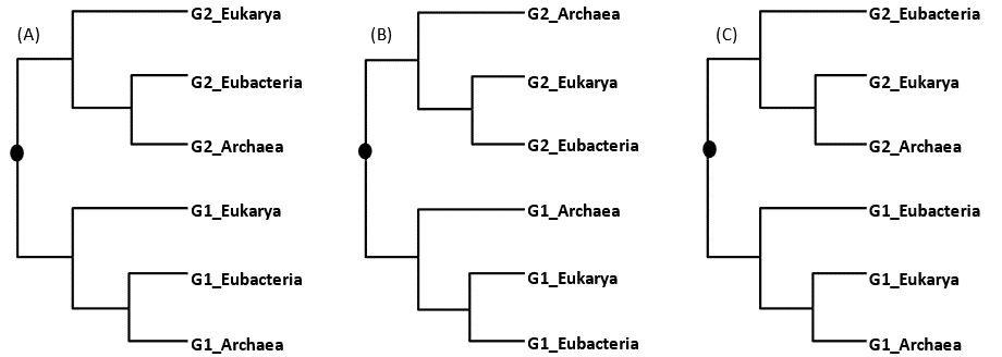Fig. 1. Testing three alternative hypotheses with the "rooting by paralogue" approach. A gene duplication event occurred before divergence among the three domains of life, leading to two paralogues (G1 and G2) in each domain. (A) Monophyly of prokaryotes. (B) Eukarya is more closely related to Eubacteria than to Archaea. (C) Eukarya and Archaea are sister lineages.