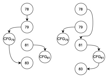 Table below shows an example where a conditional statement has a method call in each branch. When the analysis decides to parallelize the method call within the then branch (i.e., line 79) because of the WCET, the else branch will be removed from the graph; the resulting CFG is shown on the left side of the figure below. Otherwise, the then branch will be removed; see the right side of the figure.