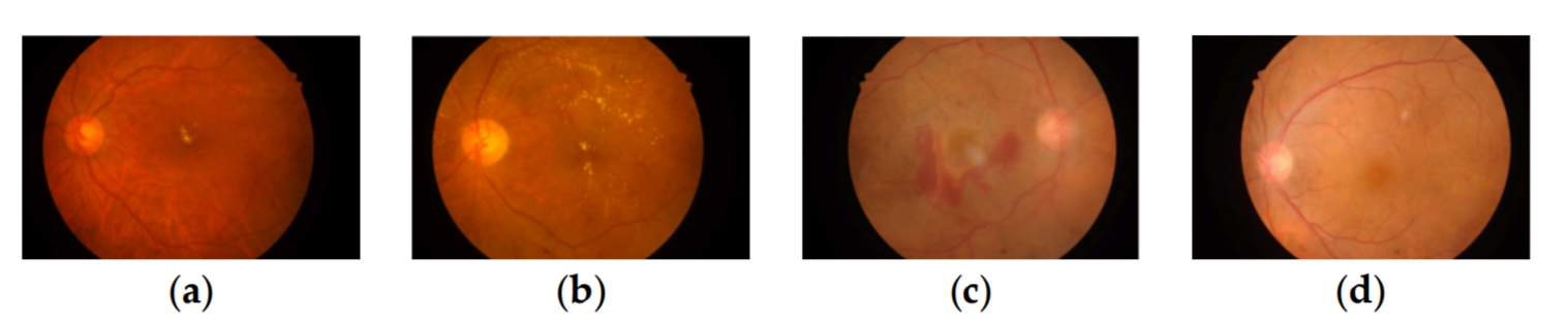 Figure 2. Example images of the degree of DR and DME pathology, (a,b) labeled DR2 DME2, (c,d) labeled DR4 DME0. (a) DR2 DME2; (b) DR2 DME2; (c) DR4 DME0; (d) DR4 DME0.