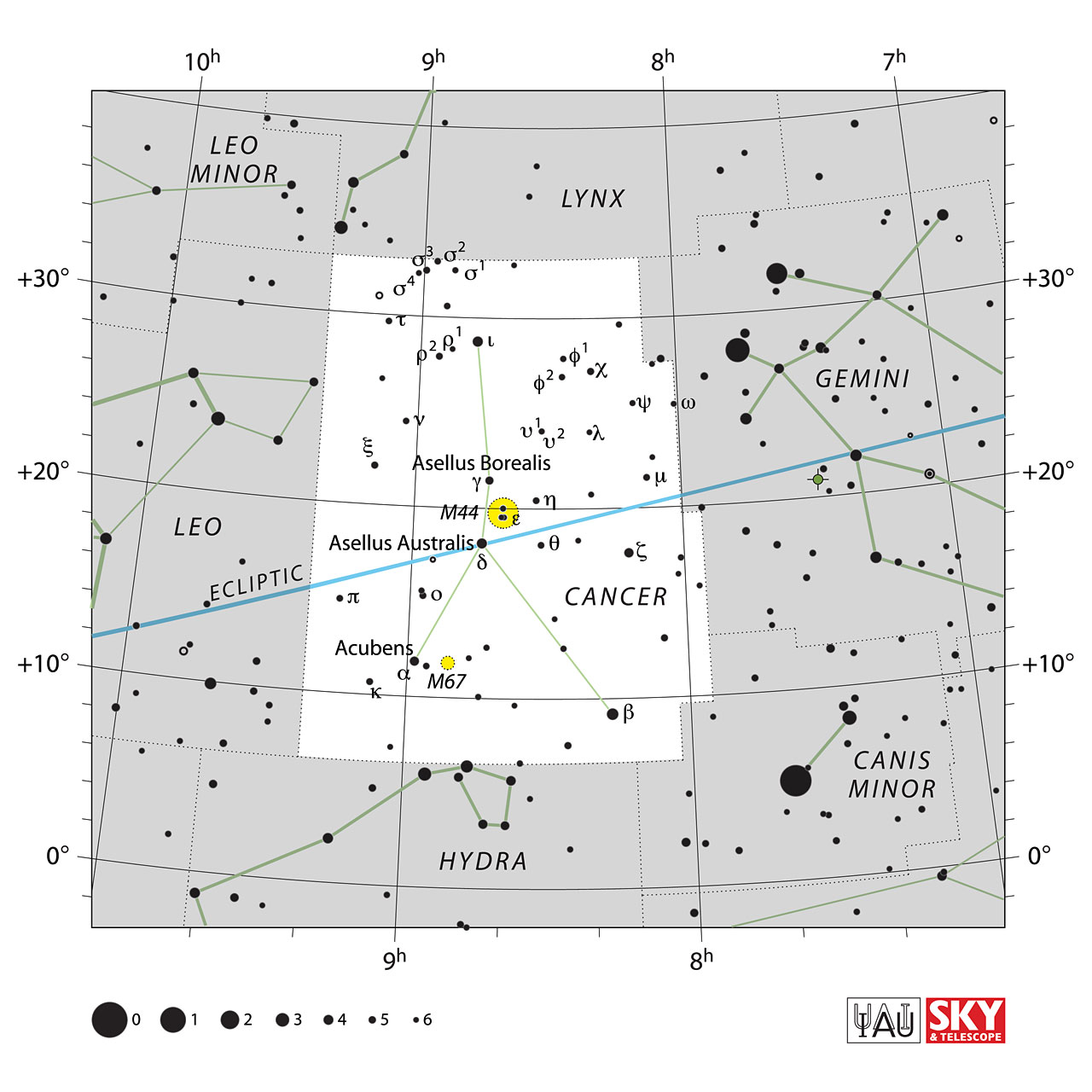 Positioned between the constellations of Gemini and Leo, Cancer occupies a relatively small area of the sky. Its celestial coordinates lie approximately between right ascension 6 hours and 9 hours and declination +20 degrees and +36 degrees (Figure 1). Due to its location along the ecliptic, Cancer is part of the zodiacal band through which the Sun, Moon, and planets appear to move throughout the year.