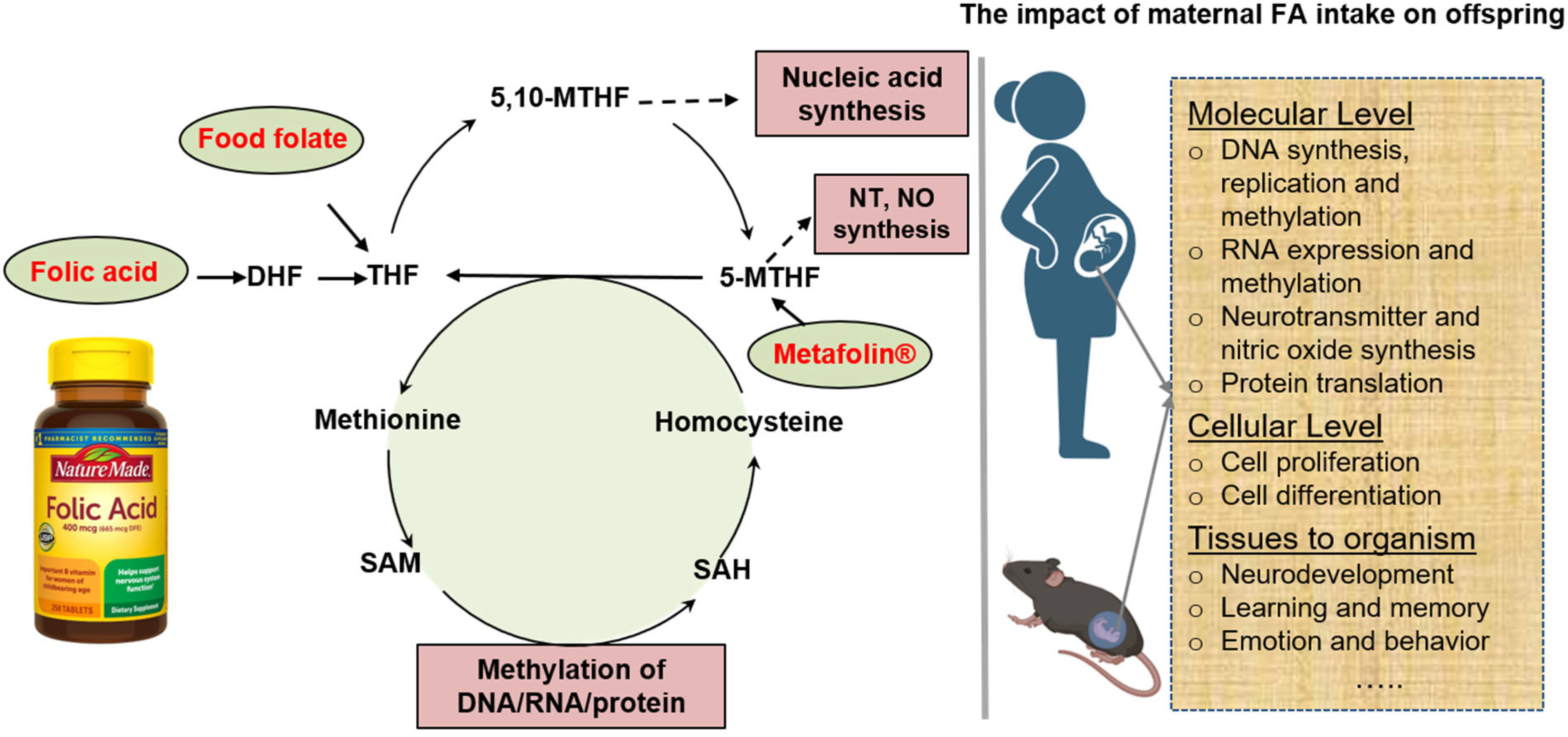 Folate, also known as vitamin B9, facilitates the transfer of methyl groups among molecules, which is crucial for amino acid metabolism and nucleotide synthesis. Adequate maternal folate supplementation has been widely acknowledged for its pivotal role in promoting cell proliferation and preventing neural tube defects.