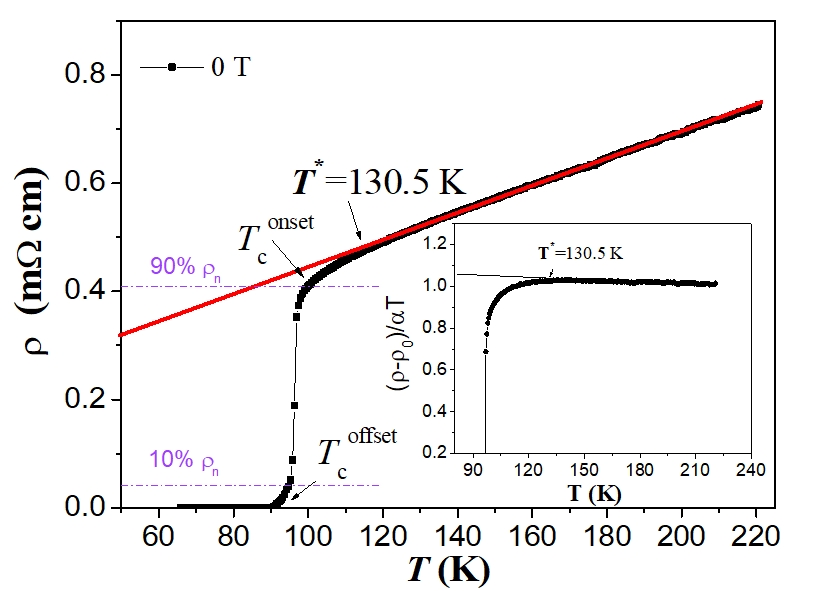 Figure 1. Resistivity ρ(T) as function of temperature for an YBCO foam strut without an applied magnetic field (μ0Ha = 0, ■). The red line shows the determination of ρn(T) by an extrapolation to the low-temperature region. The definitions for Tconset and Tcoffset are also indicated in the graph. The inset depicts the method used for determining the temperature T∗ by plotting (ρ − ρ0)/αT.