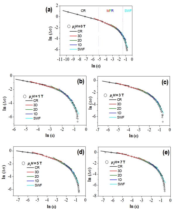 Figure 3. Plots of ln Δσ vs. ln ϵ for the YBCO foam strut sample at (a) μ0Ha = 0 T, (b) μ0Ha = 1 T, (c) μ0Ha = 3 T, (d) μ0Ha = 5 T, and (e) μ0Ha = 7 T in comparison with the Aslamazov-Larkin model. The borders between CR, MFR and SWF fluctuation regimes are indicated by vertical dotted lines in (a). The in total five fluctuation regimes recognized here are indicated by for the critical regime (CR), by for 3D fluctuations, for 2D fluctuations, for 1D fluctuations and for the SWF regime.